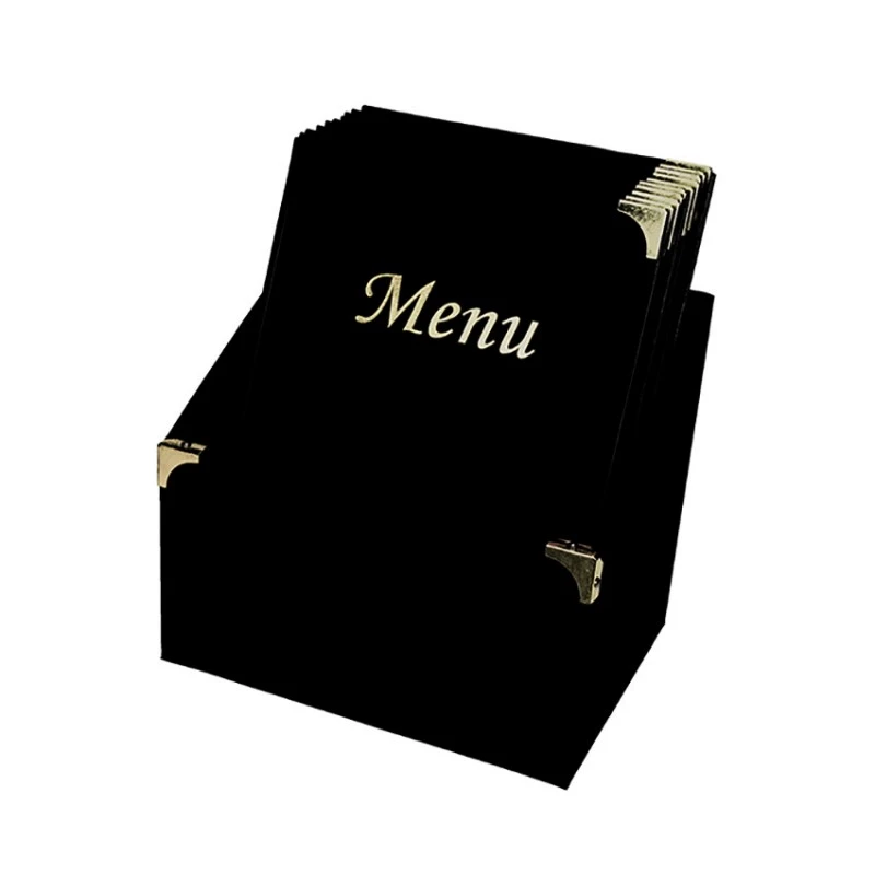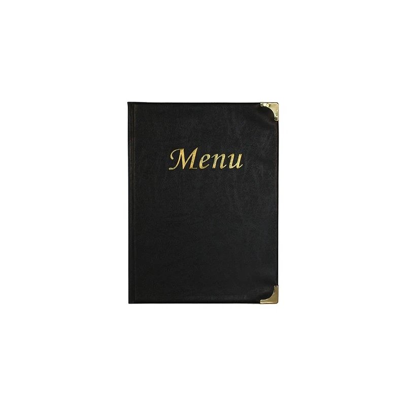 Inscription « menu » couleur dorée et coins de protection métalliques.