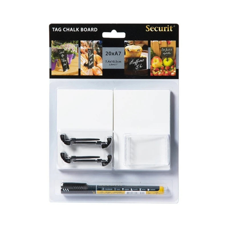 Securit® kit de 20 tags blancs au format A7. Incluant 1 feutre craie Noir, 4 piques ardoises et 2 supports horizontaux transparents.