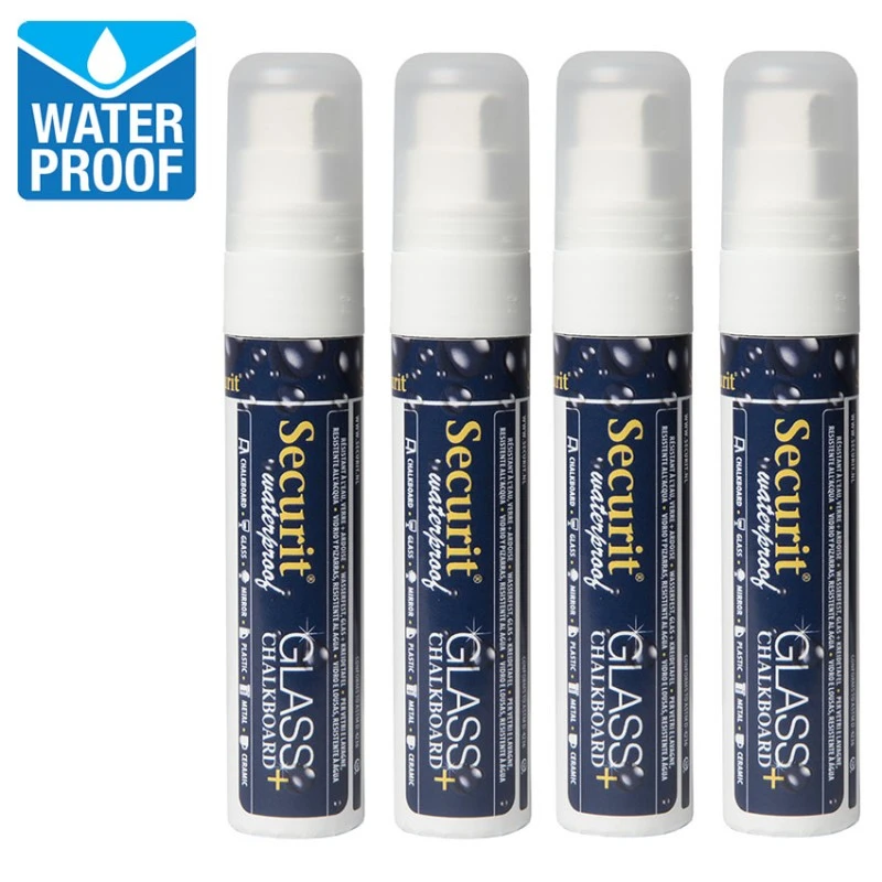 Feutres-craie Waterproof/Spécial Verre – Feutres-craie Waterproof, ne coulent pas, ne décolorent pas et s’utilisent sur toutes surfaces non-poreuses. À nettoyer avec une éponge et le spray nettoyant Securit®. Peuvent être utilisés à l’extérieur sur les vitrines et ardoises synthétique. Lot de quatre feutres-craie blanc. Epaisseur d’écriture de 7 à 15 mm.