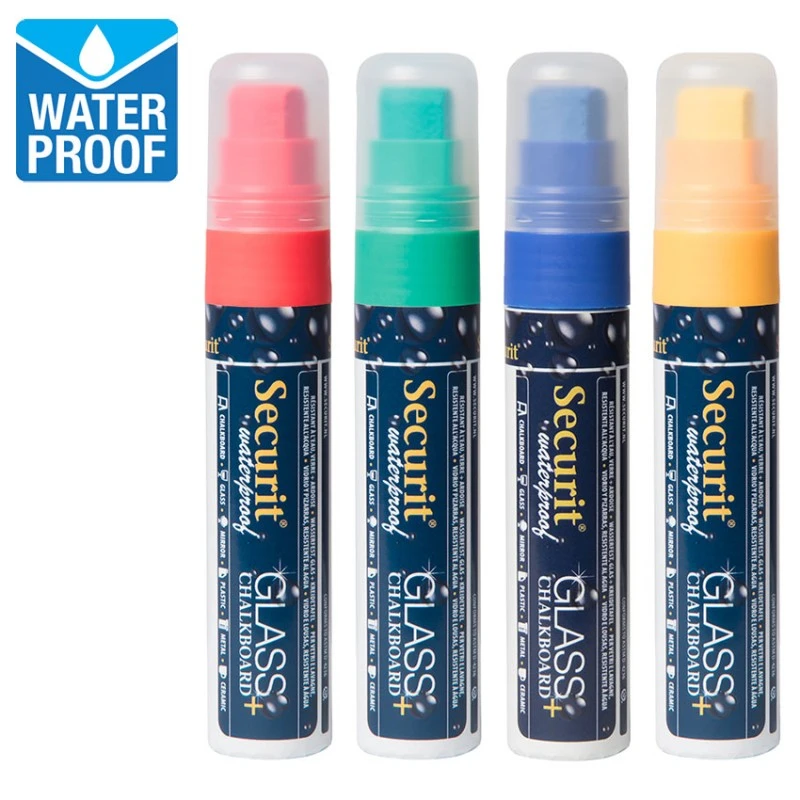 Feutres-craie Waterproof/Spécial Verre – Feutres-craie Waterproof, ne coulent pas, ne décolorent pas et s’utilisent sur toutes surfaces non-poreuses. À nettoyer avec une éponge et le spray nettoyant Securit®. Peuvent être utilisés à l’extérieur sur les vitrines et ardoises synthétique. Lot de quatre feutres-craie couleur (bleu, rouge, vert et jaune). Epaisseur d’écriture de 7 à 15 mm.