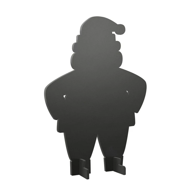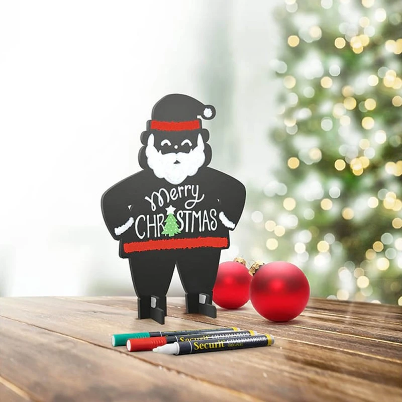 1 ardoise de table silhouette modèle Santa. Ardoise silhouette Père Noël fournie avec 3 feutres-craie aux couleurs de Noël : blanc, rouge et vert.