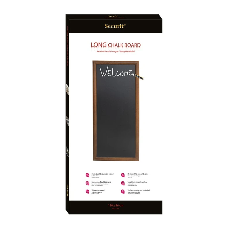 Ardoise synthétique murale pour menu restaurant et café long de Securit® en bois dur – avec finition Wengé- kit d’accroche murale inclus. Usage Intérieur et extérieur.