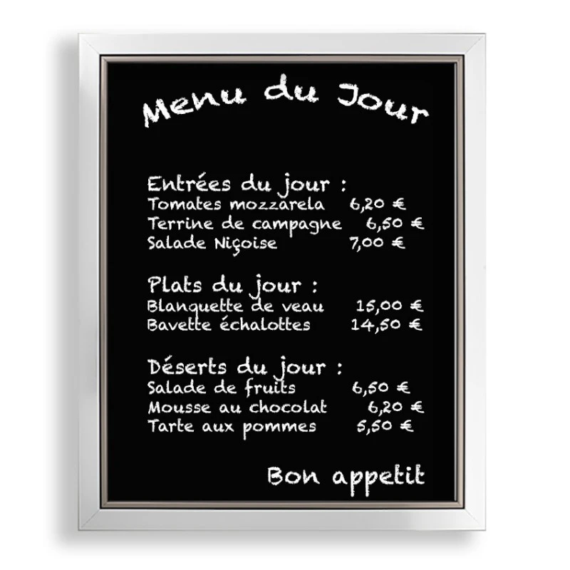 CadrArdoise est un concept novateur qui associe un cadre photo de grande qualité avec une ardoise synthétique parfaitement adapté pour la présentation d’un menu de restaurant. Présenté ici avec un cadre DESIGN de couleur ARGENT. Cadre en bois massif issu de forêts gérées durablement et de sources contrôlées. Surface d’écriture 60 x 80 cm, dimensions extérieures du cadre 65,5 x 85,5 cm. Usage intérieur exclusivement. S’utilise avec nos feutre-craies de la gamme Securit.