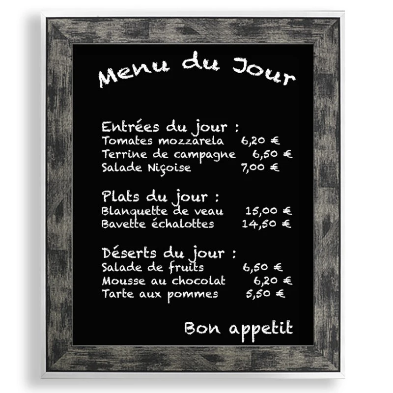 CadrArdoise est un concept novateur qui associe un cadre photo de grande qualité avec une ardoise synthétique parfaitement adapté pour la présentation d’un menu de restaurant. Présenté ici avec un cadre LOFT de couleur NOIRE. Cadre en bois massif issu de forêts gérées durablement et de sources contrôlées. Surface d’écriture 60 x 80 cm, dimensions extérieures du cadre 69,5 x 89,5 cm. Usage intérieur exclusivement. S’utilise avec nos feutre-craies de la gamme Securit.