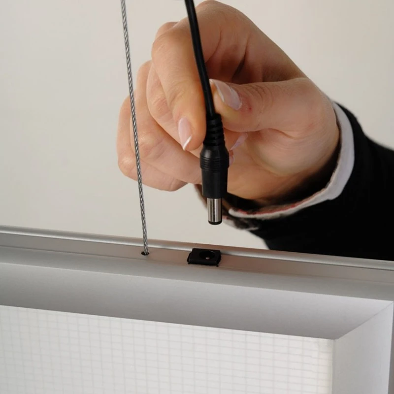 Le cadre Snap frame Led Box double face bénéficie d’une conception robuste et élégante. Le fond des deux cadres est un panneau LED offrant un éclairage homogène. Usage intérieur, à proximité d’une arrivée électrique. Un système de suspension composé de deux câbles de 200 cm avec fixation pour plafond est fourni avec le cadre.. L’épaisseur est de 27,5 mm la durée de vie de 40 000 heures environ.