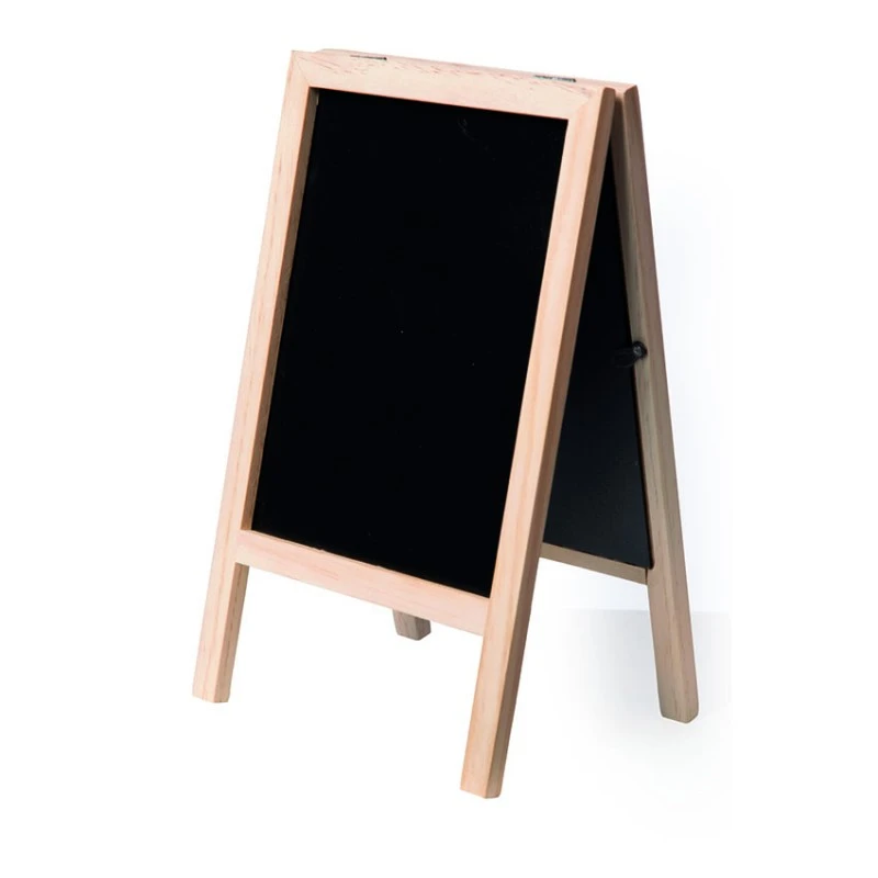 Mini chevalet de table pour présenter menu et plat du jour. Ardoise synthétique de chaque coté. Couleur hètre. Hauteur : 24 cm, largeur : 15 cm, profondeur fermée : 2 cm.