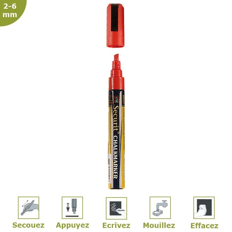 Ces feutres-craies à encre liquide sont munis d’un système de valve qui permet à la pointe de ne jamais s’assécher. Effaçable à l’aide d’un chiffon humide ou à l’aide du spray Securit®. Utilisation prévue pour : ardoise murale, panneau trottoir, vitrine, miroir et toutes les surfaces non poreuses.