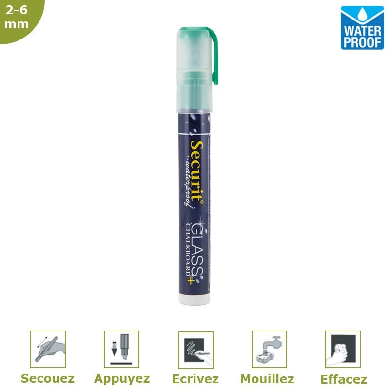Utilisation possible : verre, miroir, plastique, ardoise, tableau noir, vitrine de magasin, … Feutre-craie waterproof à encore liquide effaçable avec le nettoyant Securit.