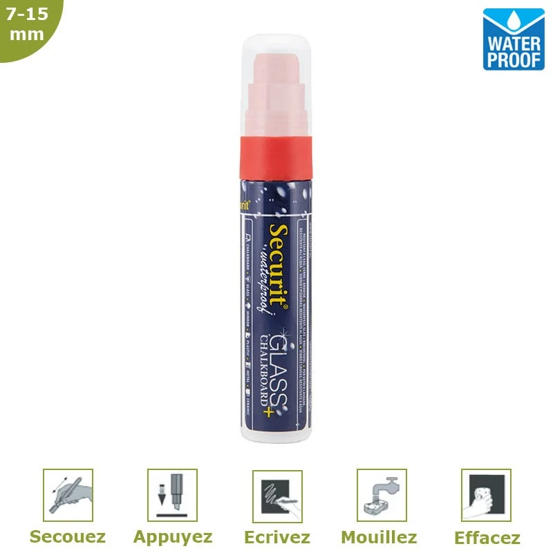 Utilisation possible : verre, miroir, plastique, ardoise, tableau noir, vitrine de magasin, … Feutre-craie waterproof à encore liquide effaçable avec le nettoyant Securit.