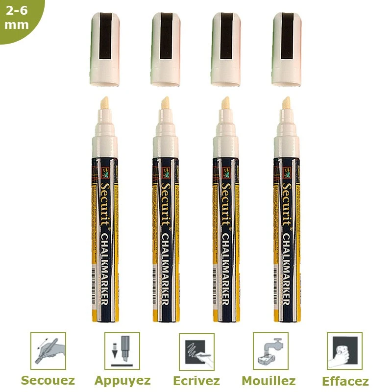 Ces feutres-craies à encre liquide sont munis d’un système de valve qui permet à la pointe de ne jamais s’assécher. Effaçable à l’aide d’un chiffon humide ou à l’aide du spray Securit®. Utilisation prévue pour : ardoise murale, panneau trottoir, vitrine, miroir et toutes les surfaces non poreuses.