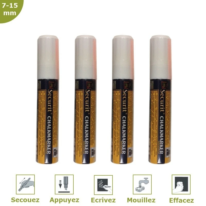 Ces feutres-craies à encre liquide sont munis d’un système de valve qui permet à la pointe de ne jamais s’assécher. Effaçable à l’aide d’un chiffon humide ou à l’aide du spray Securit®. Utilisation prévue pour : ardoise murale, panneau trottoir, vitrine, miroir et toutes les surfaces non poreuses.
