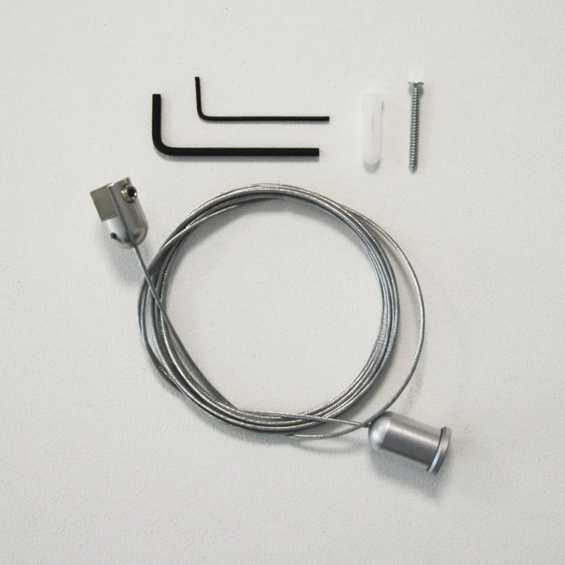 Ce kit comprend : 1 pièce fixation plafond ; 1 câble acier inox (diamètre 1,5 mm) longueur 2,50 mètres ; 1 pièce fixation support ; 2 clés Allen pour serrage.