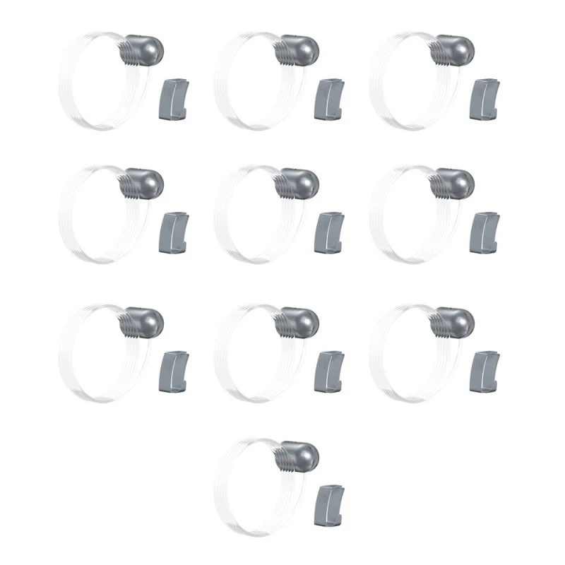 Contient : 10 embout, 10 vis, 10 chevilles, 10 câbles perlon Slider longueur 200 cm, 10 crochets autobloquant (similaire crochet STAS Smartspring).