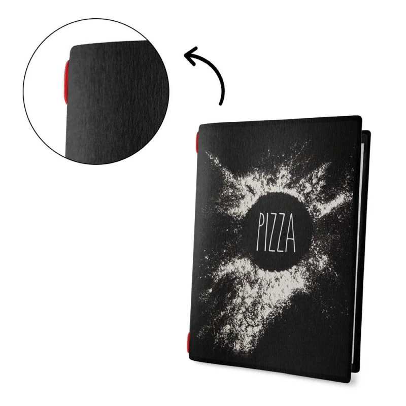 Lot de 10 protège-menus format A4 écologique de couleur noir aspect fibres lisses au toucher. Protège menu modèle NAPOLI avec inscription en blanc du texte « Pizza » orné d’un décor sur la couverture. Ce protège menu possède une épaisseur de 0.8 mm et est muni d’un insert maintenu par une corde élastique de couleur rouge permettant l’affichage de 4 vues (1 insert A4 fourni). Dimensions totales du protège menu : 23.2 cm x 31.8 cm