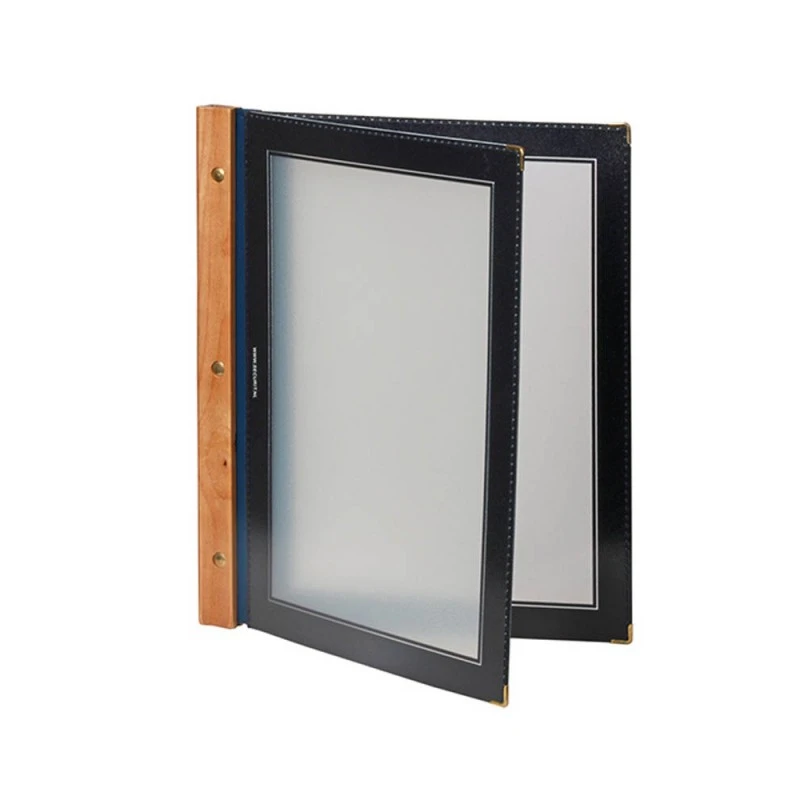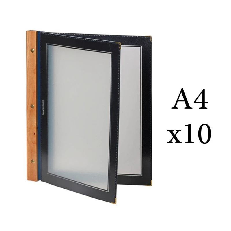 Lot de 10 protège menu bleus A4 de la gamme WOOD de chez Securit doté d’une reliure en bois (teck). Les protège menu avec reliure bois sont vendus avec 2 doubles inserts A4 de couleur bleu avec coins métalliques permettant de présenter 4 vues totales. Les inserts anti-reflets sont amovibles et assemblés grâce à la baguette en bois et des petites vis de couleur dorées. Dimensions de la fenêtre : 27 x 18 cm. Possibilité d’ajouter 7 inserts maximum soit 14 vues.