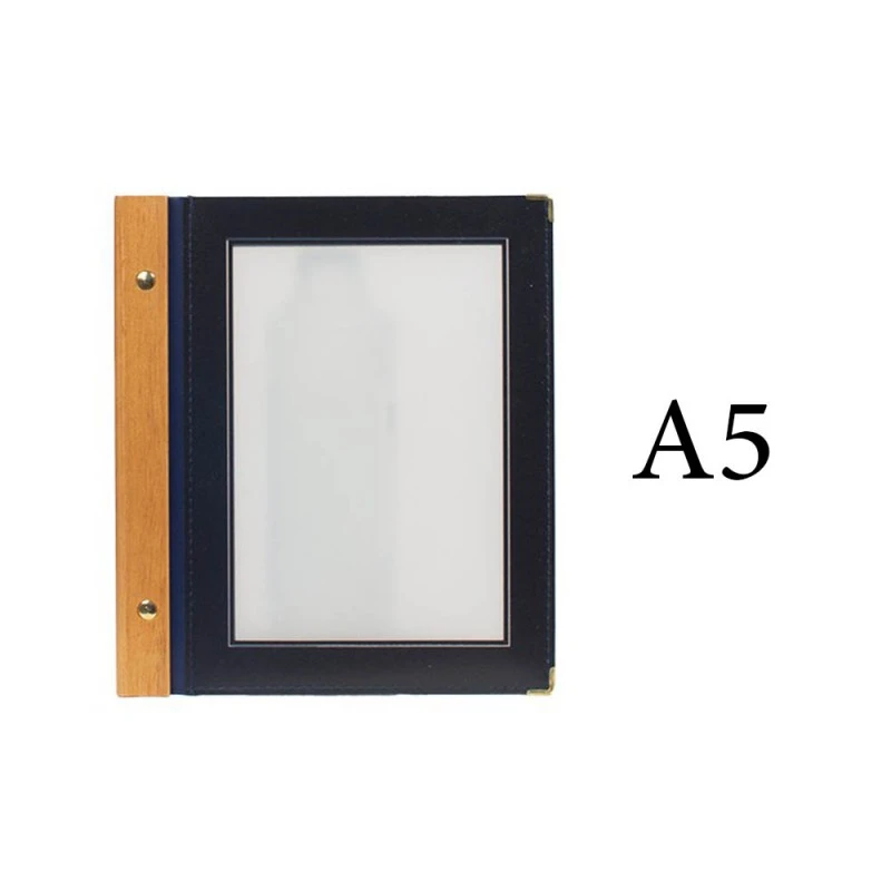 Lot de 10 protège menu bleus A5 de la gamme WOOD de chez Securit doté d’une reliure en bois (teck). Les protège menu avec reliure bois sont vendus avec 2 doubles inserts A5 de couleur bleu avec coins métalliques permettant de présenter 4 vues totales. Les inserts anti-reflets sont amovibles et assemblés grâce à la baguette en bois et des petites vis de couleur dorées. Dimensions de la fenêtre :13 x 19 cm. Possibilité d’ajouter 7 inserts maximum soit 14 vues.
