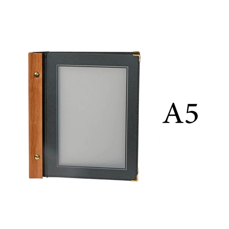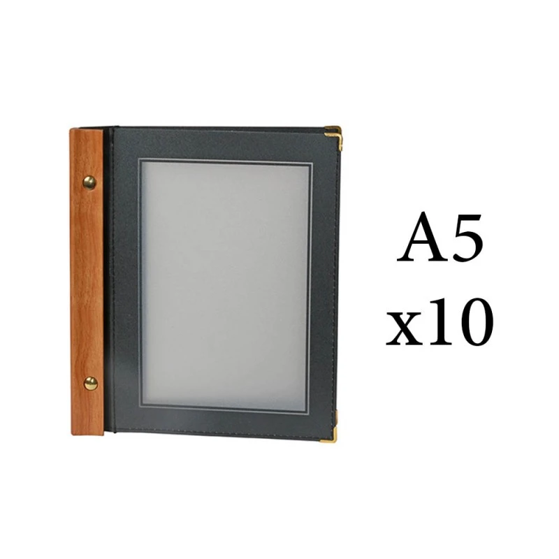 Lot de 10 protège menu noirs A5 de la gamme WOOD de chez Securit doté d’une reliure en bois (teck). Les protège menu avec reliure bois sont vendus avec 2 doubles inserts A5 de couleur noir avec coins métalliques permettant de présenter 4 vues totales. Les inserts anti-reflets sont amovibles et assemblés grâce à la baguette en bois et des petites vis de couleur dorées. Dimensions de la fenêtre : 13 x 19 cm. Possibilité d’ajouter 7 inserts maximum soit 14 vues.