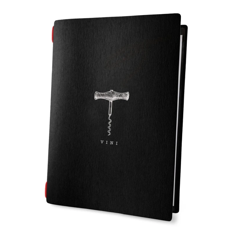 Protège menu modèle VINI avec inscription en blanc du texte « Vini » orné d’un tire-bouchon sur la couverture.