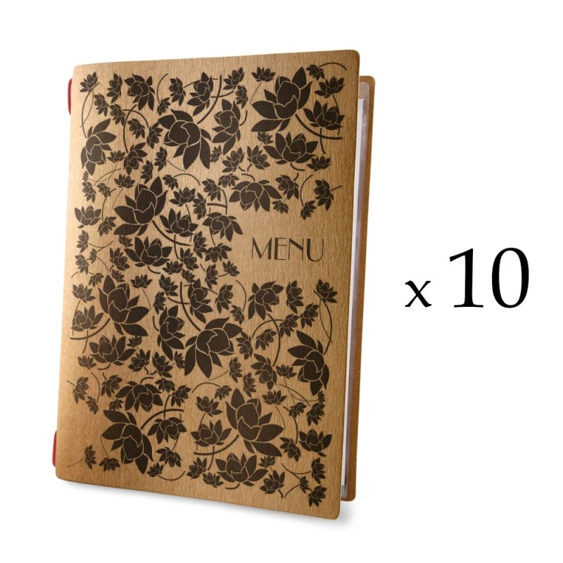 Lot de 10 protège-menus format A4 écologiques de couleur naturel aspect fibres lisses au toucher. Protège-menu modèle PROVENÇAL avec inscription en noir « Menu » orné de fleurs sur la couverture. Ce protège-menu possède une épaisseur de 0.6 mm et est muni d’un insert maintenu par une corde élastique de couleur rouge permettant l’affichage de 4 vues (1 insert A4 fourni). Dimensions totales du protège-menu : 23.2 cm x 31.8 cm.
