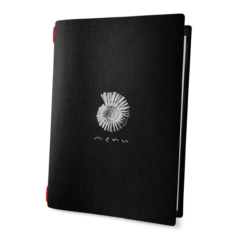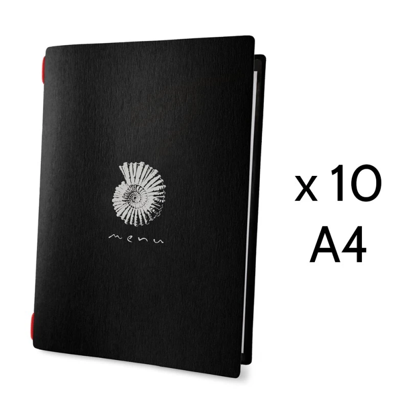Lot de 10 protège-menus format A4 écologique de couleur noir aspect fibres lisses au toucher. Protège menu modèle NETTUNO avec inscription en blanc du texte « Menu » orné d’un logo forme coquillage sur la couverture. Ce protège menu possède une épaisseur de 0.8 mm et est muni d’un insert maintenu par une corde élastique de couleur rouge permettant l’affichage de 4 vues (1 insert A4 fourni). Dimensions totales du protège menu : 23.2 cm x 31.8 cm