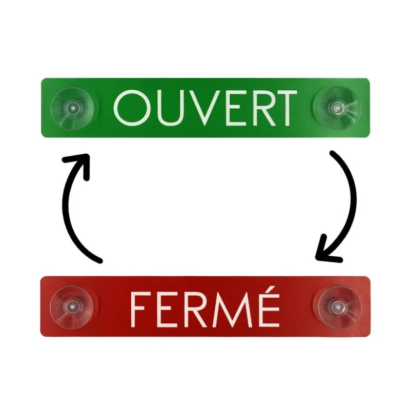Plaque recto/verso avec inscription « OUVERT » et « FERMÉ » fournie avec 2 ventouses.