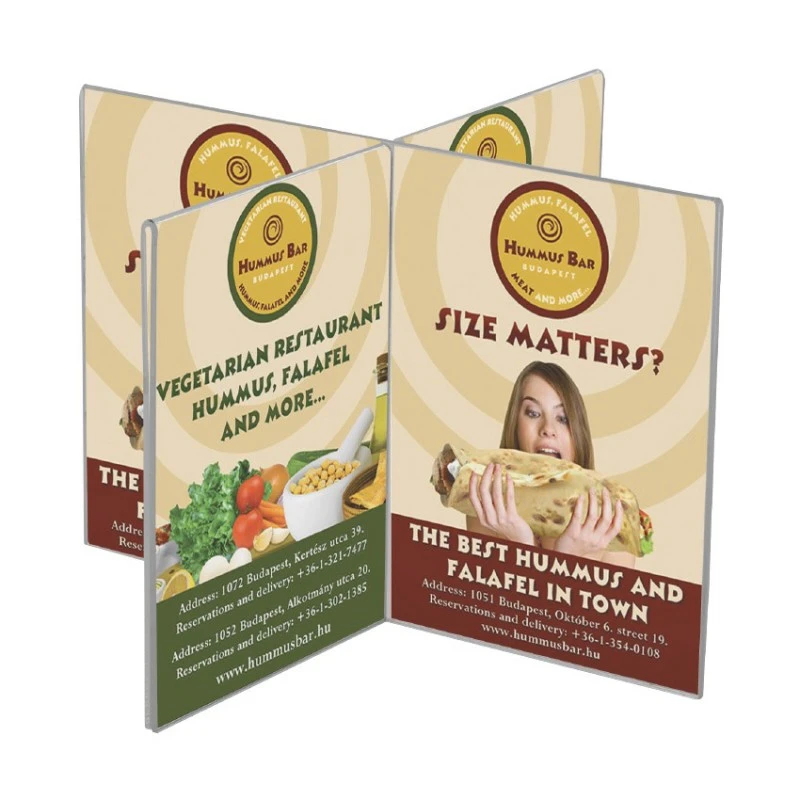 Présentoir de table en plexi en forme de croix. Modèle de porte-menu de table en plexi disponible au format A5 et format A6. Porte-menu pour table de restaurant hôtel utilisable en intérieur et extérieur, idéal pour présenter les cartes de menus / boissons disponible grâce aux 8 vues disponibles.