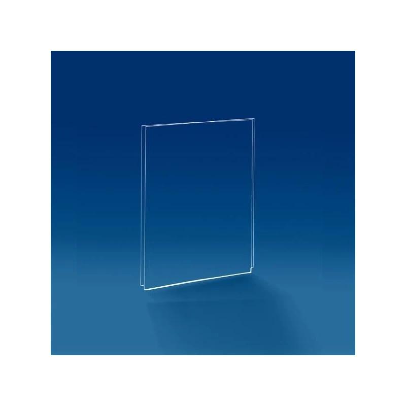 Porte affiches verticaux en plexi de 3 mm pour vitrine de magasin. Installation sur câbles ou sur tiges.