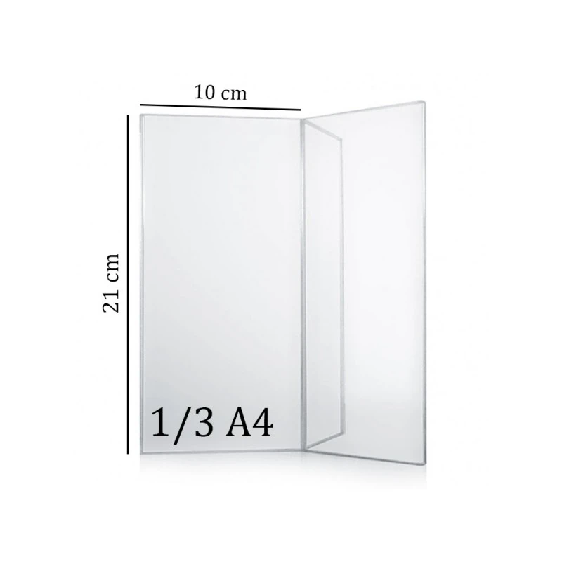 Présentoir pour menu de table ou porte affiche intérieur et extérieur format 1/3 A4. Porte menu de table en forme de Y, support triptyque pour affichage du menu, carte des boissons, desserts, … Porte affiche conçu en plexiglass transparent robuste. Formats compatibles : 3 feuilles recto / verso 21 x 10 cm soit 6 vues totales.