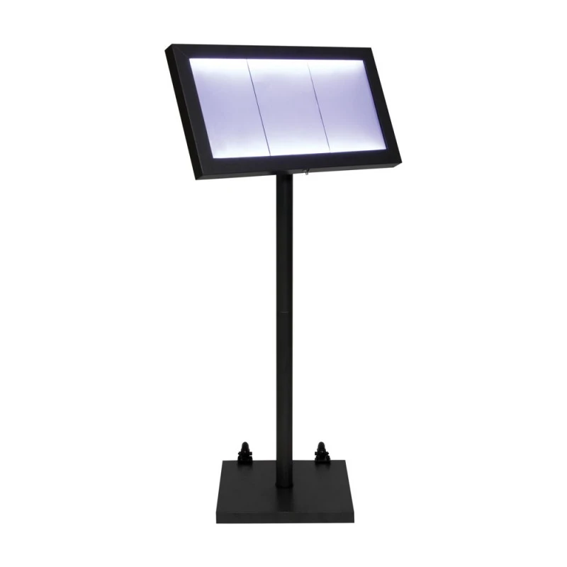 Porte-menu en acier galvanisé, avec éclairage LED (télécommande) pour affichage de 3 pages A4. Inclus le porte-menu et 1 pied de 135 cm.