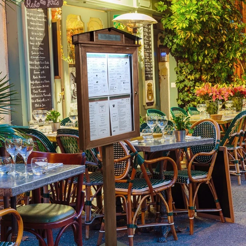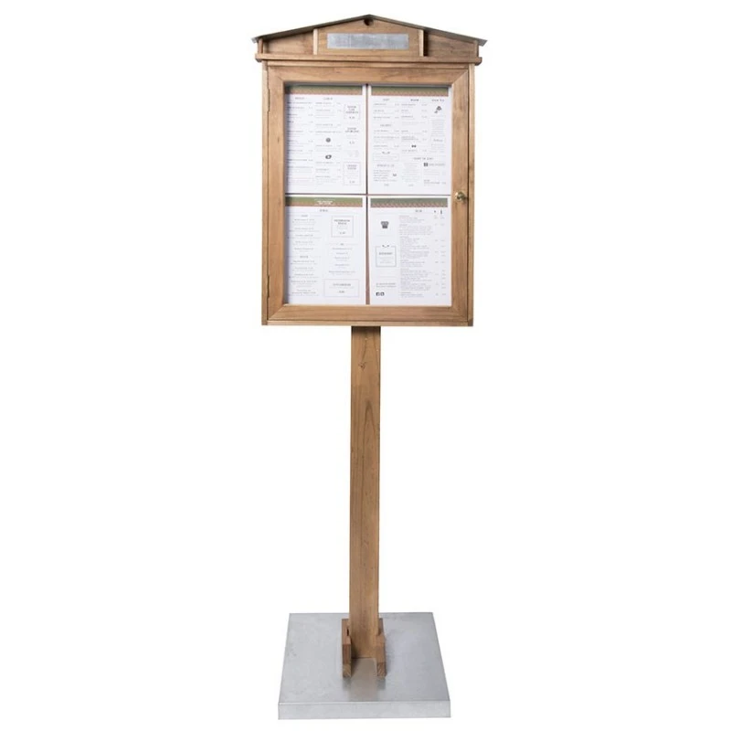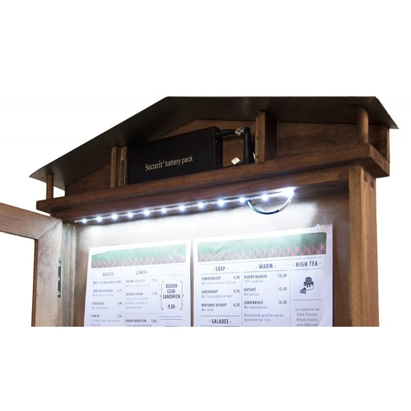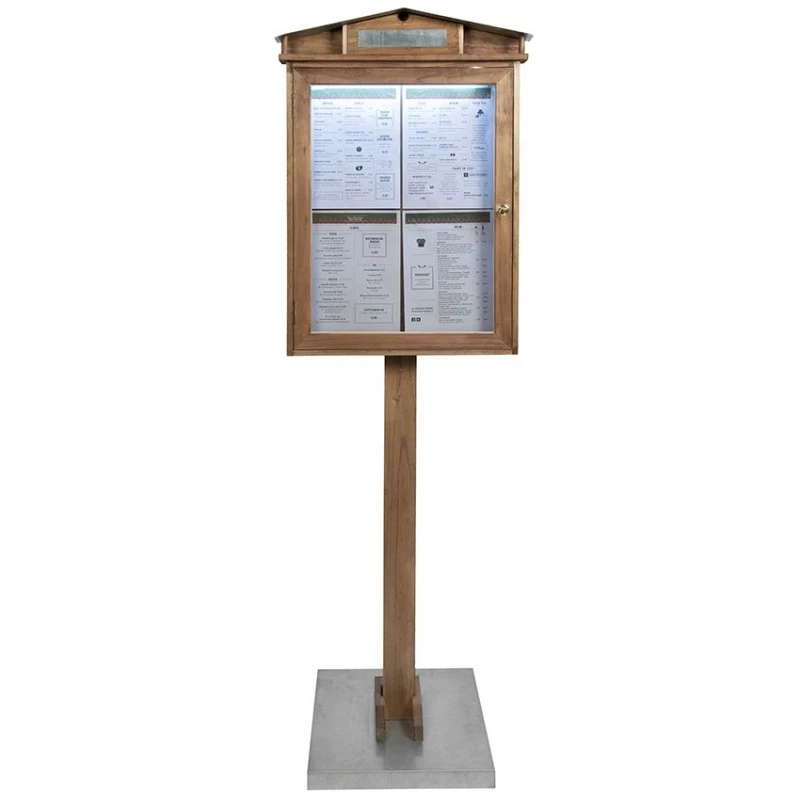 Porte-menu éclairé LED rustic (plaque Menu personnalisable en supp). Cadre en bois usage extérieur avec toit en zinc. Modèle sur pied, peut être utilisé en intérieur ou en extérieur. L’alimentation se fait grâce à un câble secteur de 5 mètre ou une batterie Securit(non incluse). Permet d’afficher 4 A4.