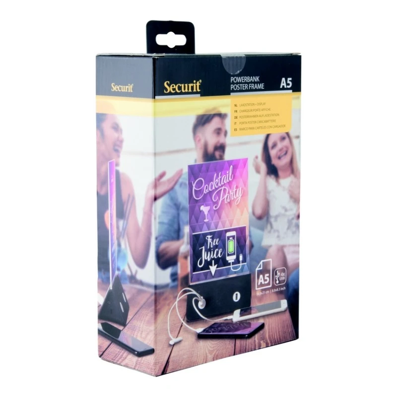 Adoptez une déco tendance avec ce porte menu / porte affiche high-tech. Disposez ce porte menu sur les tables de votre hôtel – restaurant et vos clients pourront recharger leur smartphone / tablette au cours d’un repas. Un lot de 4 câbles USB sont inclus.