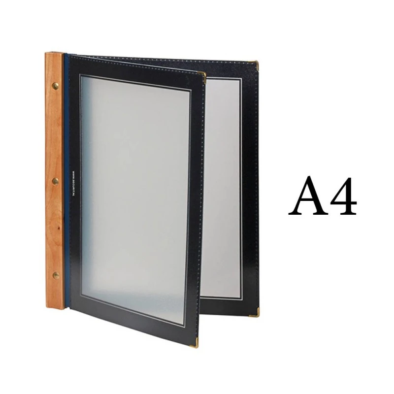 Protège menu de la gamme WOOD de chez Securit doté d’une reliure en bois (teck). Ce protège menu avec reliure bois est vendu avec 2 doubles inserts A4 de couleur bleu avec coins métalliques permettant de présenter 4 vues totales. Les inserts anti-reflets sont amovibles et assemblés grâce à la baguette en bois et des petites vis de couleur dorées. Dimensions de la fenêtre : 27 x 18 cm. Possibilité d’ajouter 7 inserts maximum soit 14 vues.