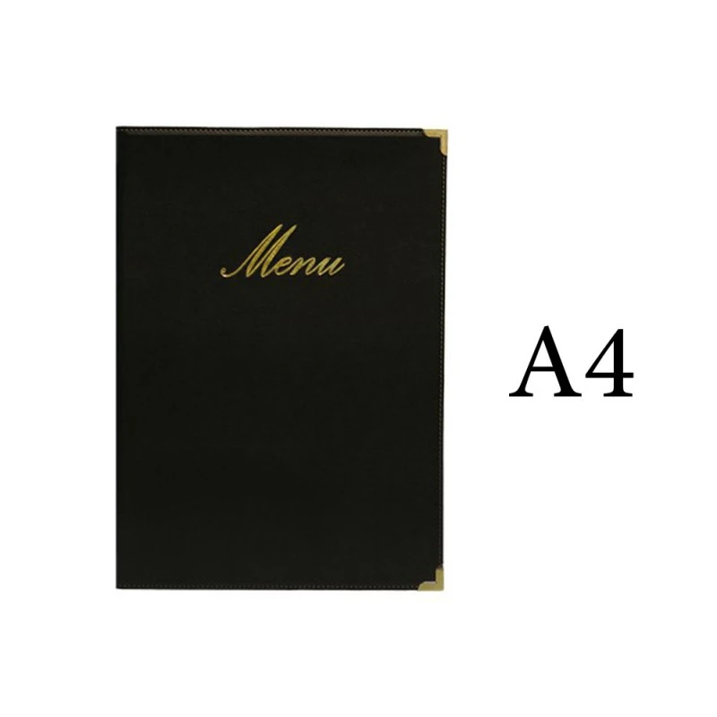 Protège-menu noir modèle Classique au format A4 avec inscription couleur doré « Menu » en relief sur la couverture avec bords cousus. Protège-menu idéal pour les professionnels de la restauration et hôtellerie grâce à sa matière facile à nettoyer. Ce protège-menu noir format A4 dispose d’un insert relié par une corde élastique vous permettant d’afficher 4 vues totales. Possibilité d’ajouter jusqu’à 10 inserts soit 40 vues totales.