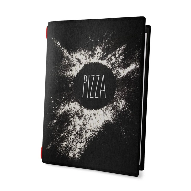 Protège menu format A4 écologique de couleur noir aspect fibres lisses au toucher. Protège menu modèle NAPOLI avec inscription en blanc du texte « Pizza » orné décor sur la couverture. Ce protège menu possède une épaisseur de 0.8 mm et est muni d’un insert maintenu par une corde élastique de couleur rouge permettant l’affichage de 4 vues (1 insert A4 fourni). Dimensions totales du protège menu : 23.2 cm x 31.8 cm