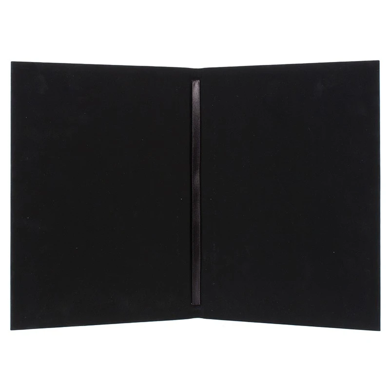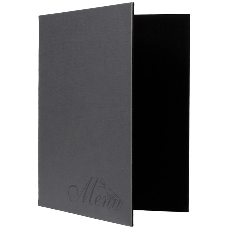Design velvet Protège-menus A4, 1 double insert est inclus avec chaque protège-menu (présente 4 pages A4). Il est possible d’ajouter jusqu’à 10 insert soit 40 pages. Souple et facile à nettoyer. Corde élastique reliant les inserts. inscription « menu »en relief, bords cousus