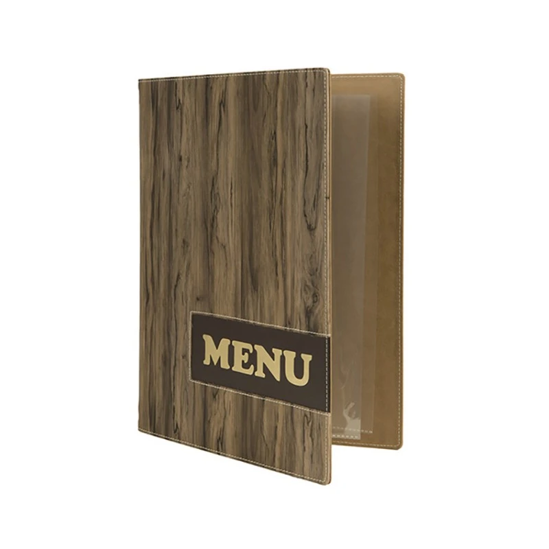 Protège-menus de la gamme Design – A4, 1 double insert est inclus avec chaque protège-menu (présente 4 pages A4). Il est possible d’ajouter jusqu’à 10 insert soit 40 pages. Souple et facile à nettoyer. Corde élastique reliant les inserts. inscription « menu »en relief, bords cousus