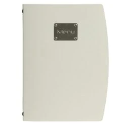 Protège-menus Rio blanc A4, 1 double insert est inclus avec chaque protège-menu (présente 4 pages A4). Il est possible d’ajouter jusqu’à 10 insert soit 40 pages. Souple et facile à nettoyer. Corde élastique reliant les inserts. Plaquette métallique « Menu »