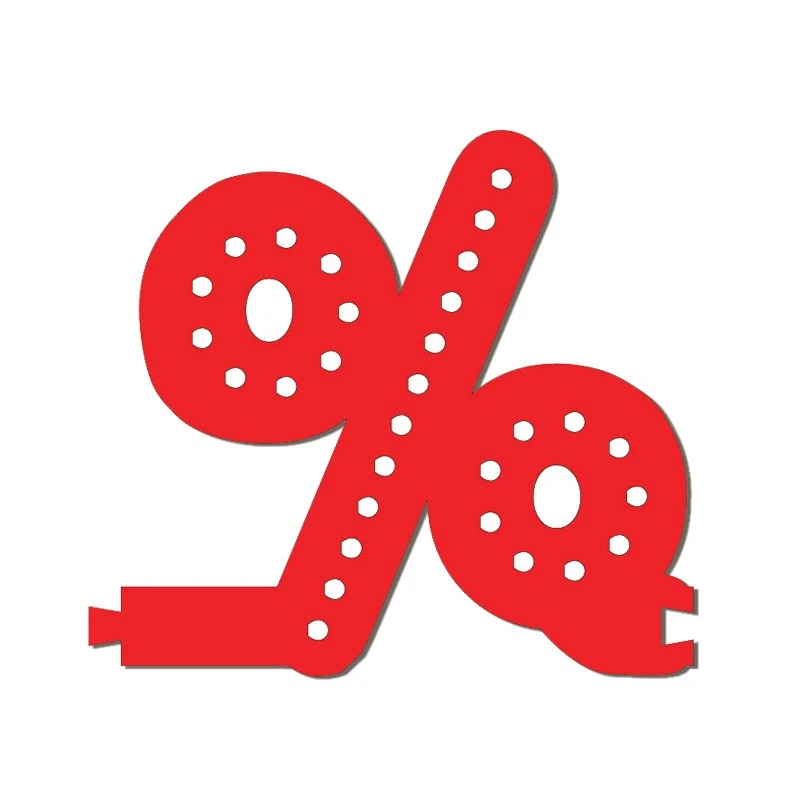 Signe, symbole « % » de couleur rouge. Signe lumineux « % » avec éclairage LED. A combiner avec un câble perlon transparent pour suspension vitrine (non fourni).