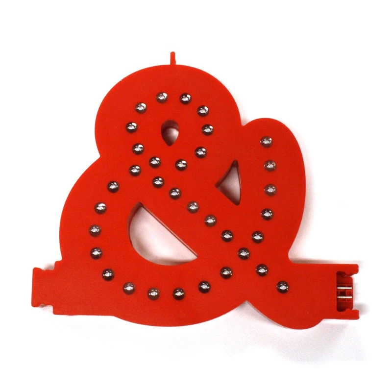 Signe, symbole « & » de couleur rouge. Signe lumineux « & » avec éclairage LED. A combiner avec un câble perlon transparent pour suspension vitrine (non fourni).